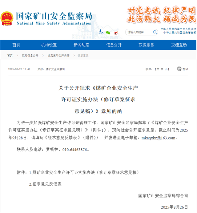 为进一步加强煤矿安全生产许可证管理工作,国家矿山安全监察局起草了《煤矿企业安全生产许可证实施办法(修订草案征求意见稿)》(附件1),现向社会公开征求意见,截止时间为2025年9月28日,请填写《征求意见反馈表》(附件2,页面底部阅读原文可免费下载),并发送至电子邮箱:mkaqxkz@163.com。